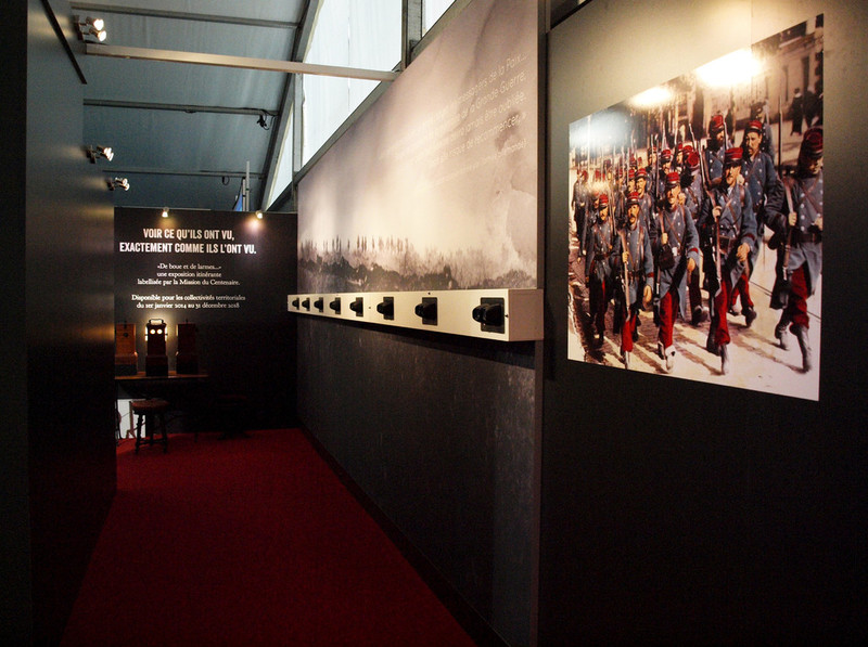 L’espace se développe autour de bornes stéréoscopiques anciennes ainsi que d’une photographie lenticulaire géante d’un soldat. Le ministre des armées, Jean-Yves Le Drian, s’attarde longuement derrière les bornes d’époque et leurs vues originales en 3D de la grande guerre. L’expérience visuelle proposée stupéfie également le journaliste de Ouest-France : le stand fait la une du quotidien le lendemain de l’inauguration.